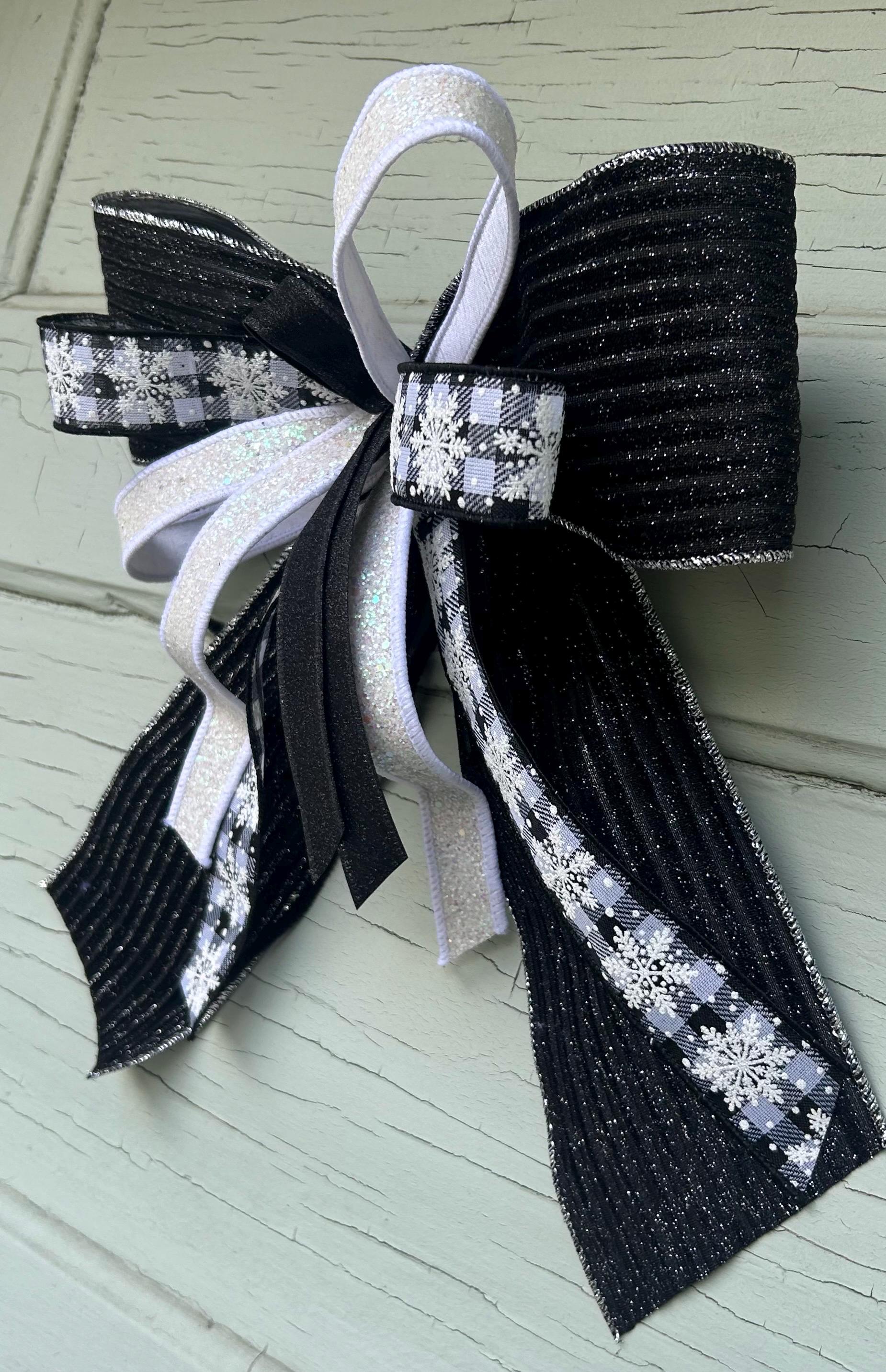This bow has a striking black-and-white color scheme that combines a textured black ribbon with a checkered pattern featuring snowflakes, creating a wintry, festive look. The glittering accents in the ribbons add a shimmering effect that enhances its appeal. The bow is a perfect choice for winter or holiday decorations, wreaths, or gifts, offering a blend of rustic and elegant style.