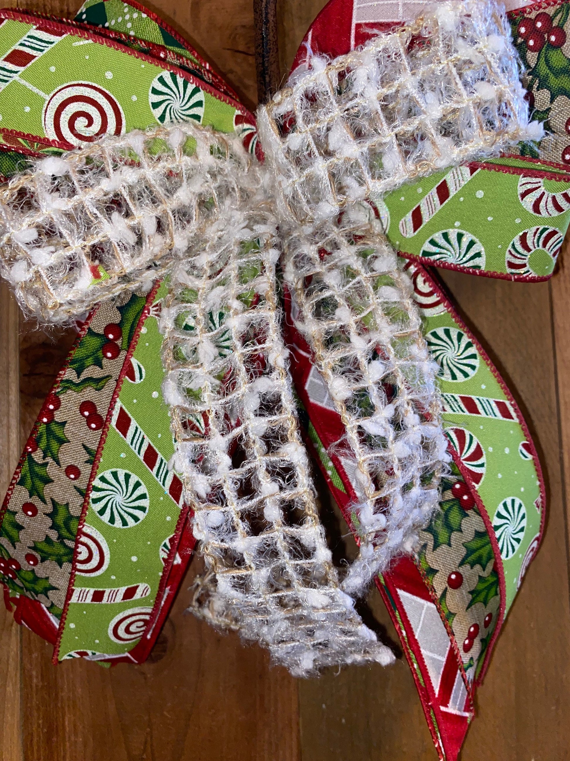 The ribbons chosen for this bow have been carefully selected to coordinate seamlessly, creating a visually stunning arrangement. Adorned with charming candies and vibrant Holly berries, the bow exudes a playful and joyful spirit. The centerpiece of this whimsical masterpiece is the snowdrift designer ribbon, which takes center stage at the front, adding a touch of elegance and uniqueness.