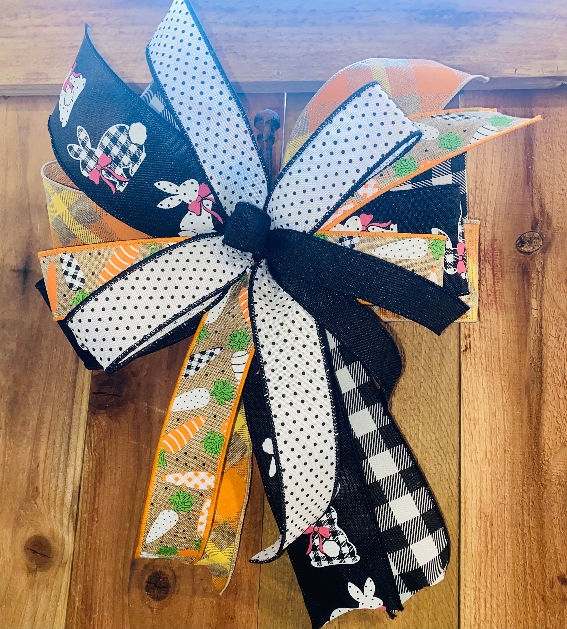 Spring bow with 6 coordinating ribbons. First layer is black checkered 6 in loops, 2nd layer is natural with orange and yellow 6 in loops, third layer is black with gingham bunnies 5 inch loops, 4th layer is natural with carrots, 5th layer is white with dots and last layer is a 7/8 in black loop. Perfect to jazz up anything for Spring or Bunny Rabbit related. The tails can be cut down or left as is.
