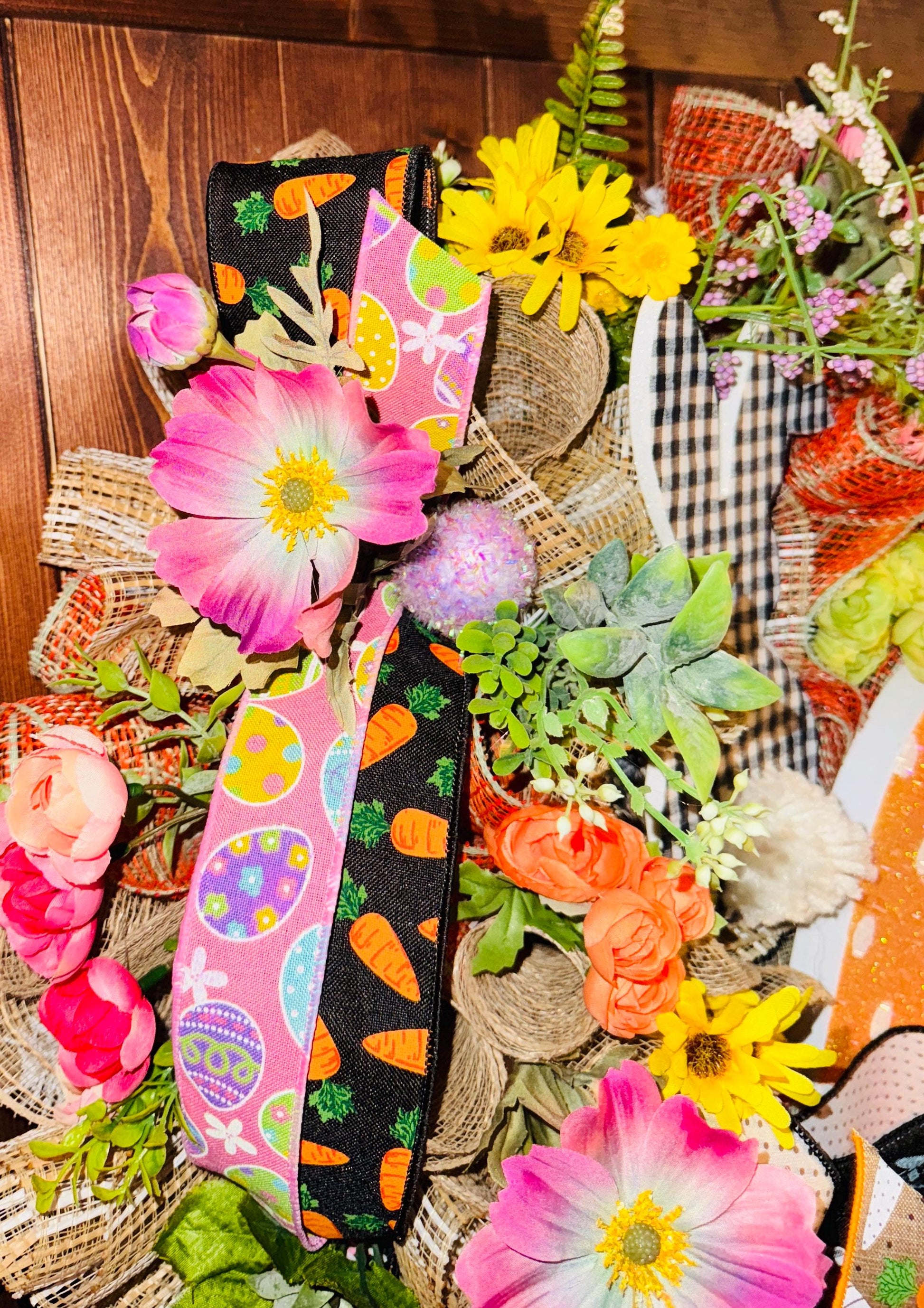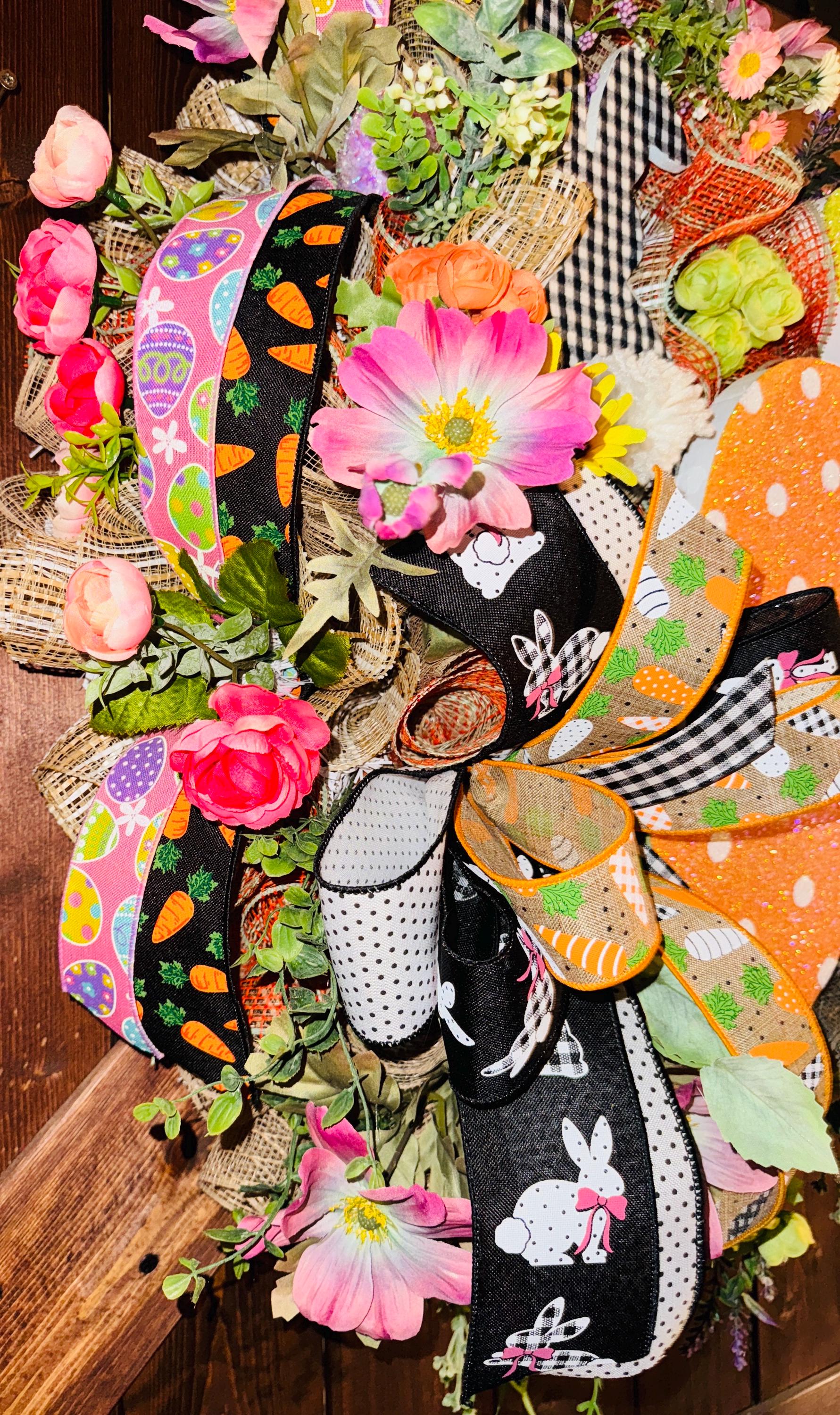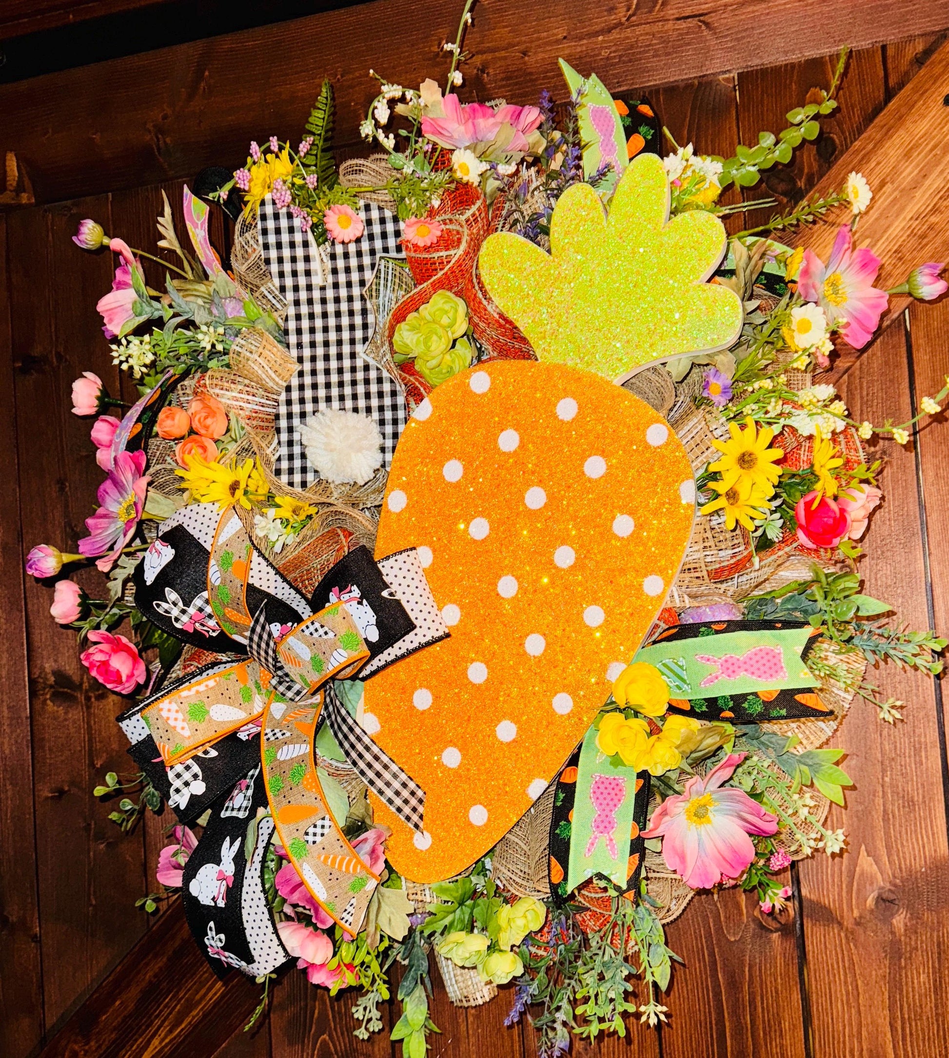 Welcome spring and Easter with this vibrant handmade wreath, designed to bring a cheerful and festive touch to your home! This stunning wreath features a whimsical mix of artificial florals, greenery, and decorative accents, including a large glittery polka-dot carrot and an adorable gingham bunny silhouette with a fluffy tail. The carefully crafted bows showcase fun Easter-themed ribbons with bunnies, carrots, and classic black-and-white patterns, making this wreath a standout piece for your front door or home decor.