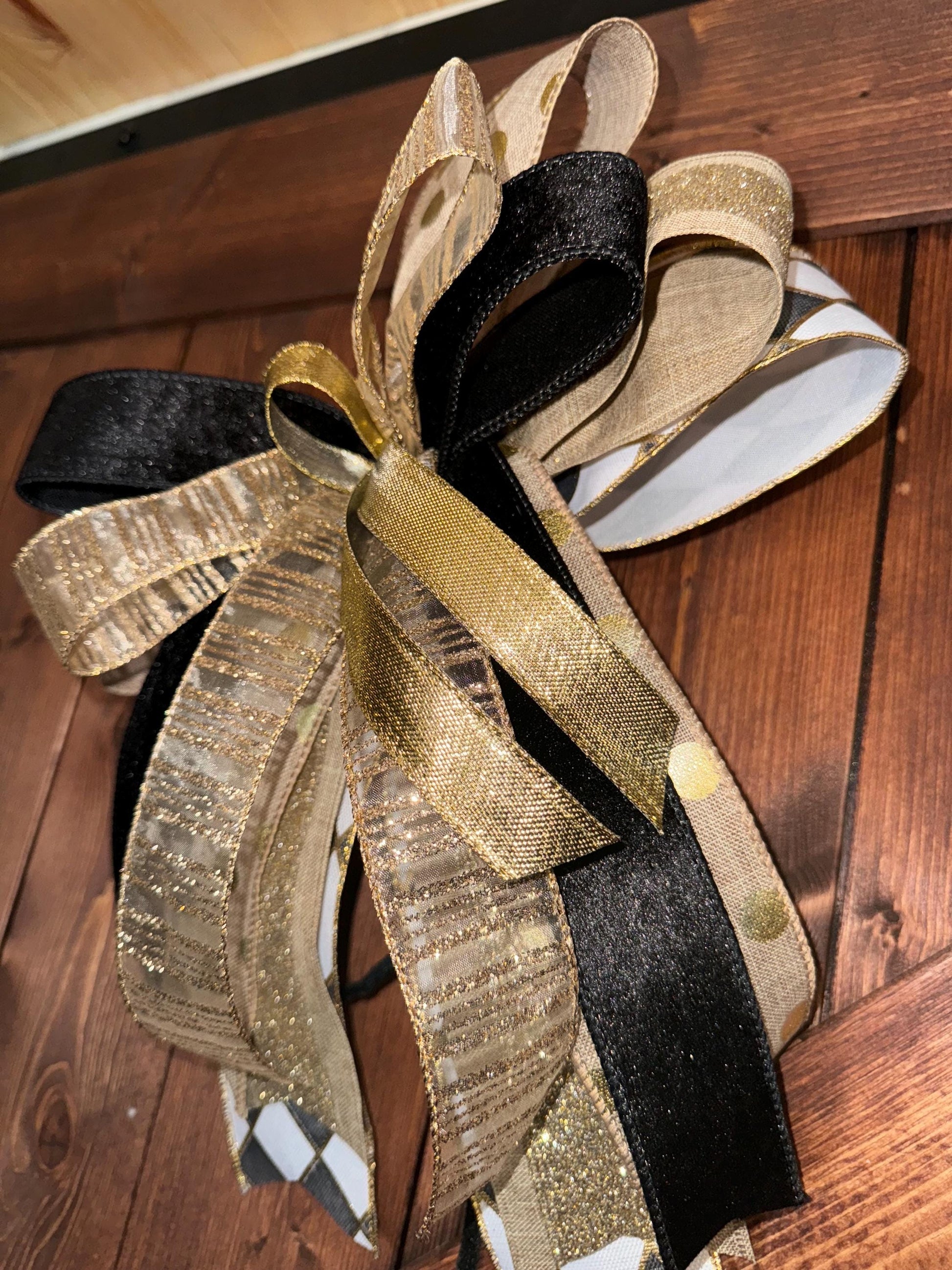 Add a touch of elegance to your decor with this handcrafted black and gold bow. Made with high-quality ribbon, this bow features a sophisticated mix of textures and patterns, including shimmering gold polka dots, bold black velvet, and metallic gold accents. Perfect for adding flair to wreaths, garlands, centerpieces, or as a decorative accent on gift packages. This versatile bow is ideal for year-round use or to elevate your seasonal decor.