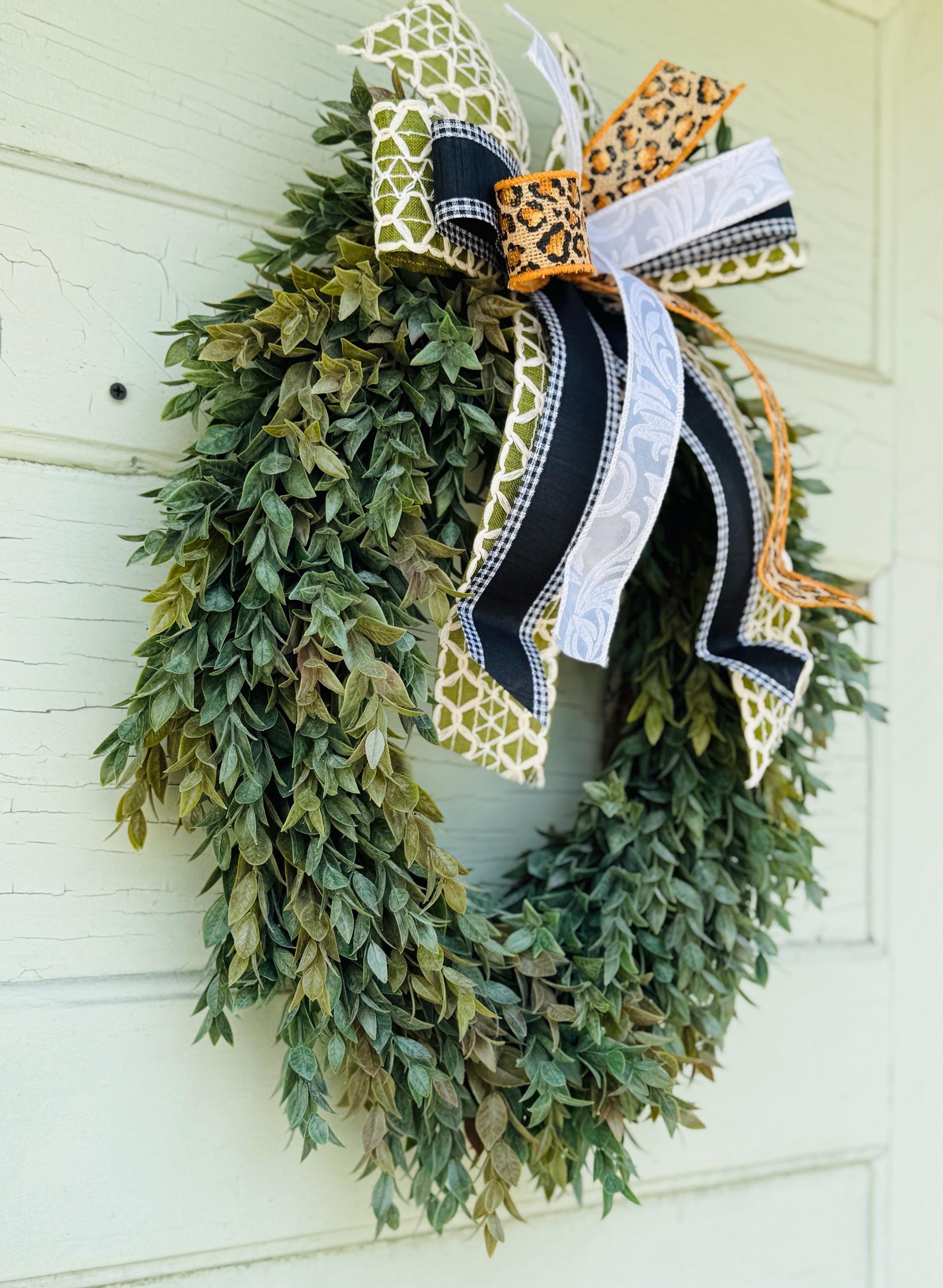 Add a touch of rustic charm to your home with this handcrafted greenery wreath, styled with soft gray and green tones on a grapevine base. Accented with a stunning multi-ribbon bow featuring leopard print, farmhouse gingham, and textured patterns, this wreath is both eye-catching and timeless.