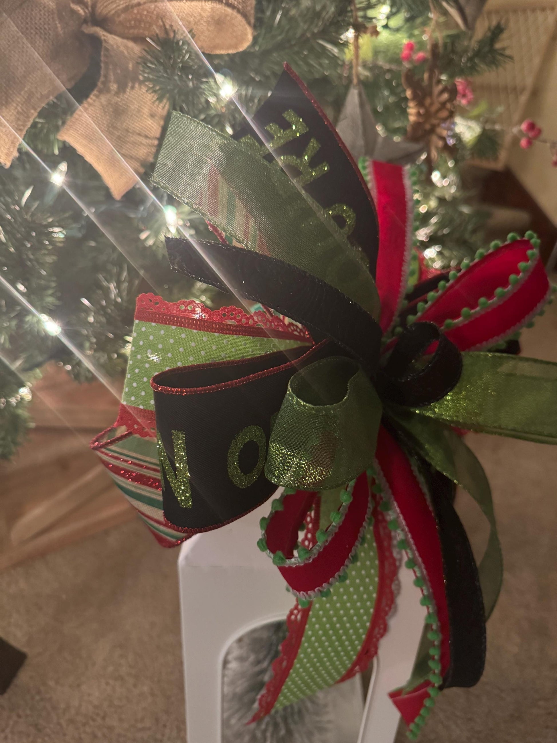 Add a playful and festive touch to your holiday decor with this eye-catching Green Monster Bow! This vibrant bow features layers of luxurious ribbon in bold shades of green, black, and red, accented with playful polka dots and whimsical pom-pom trim. The shimmering green ribbons glisten under the lights, while the bold black ribbon adds a touch of contrast with printed lettering. Perfect for adding a fun and spirited vibe to your wreaths, gift packages, or as a decorative accent on lanterns and more, this bow is sure to spread cheer all season long!