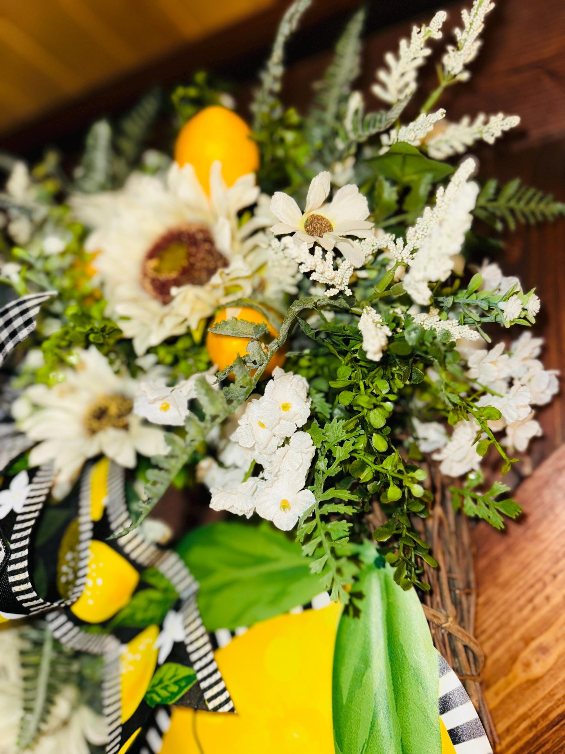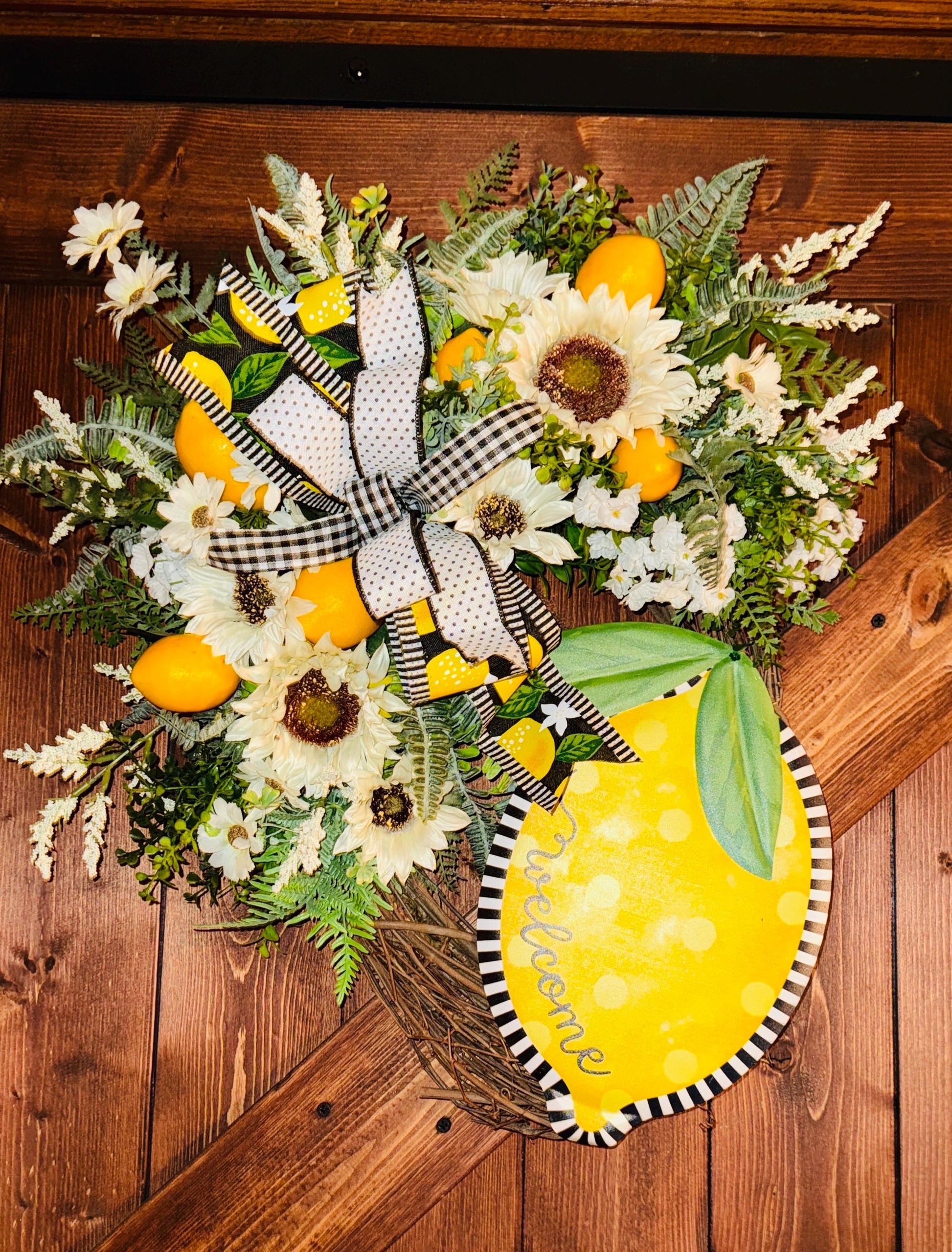 Lemon Welcome Grapevine Wrearh with sunflowers and lemons Farmhosue Rustic design for front door wall decor for porch entryway Lemon design