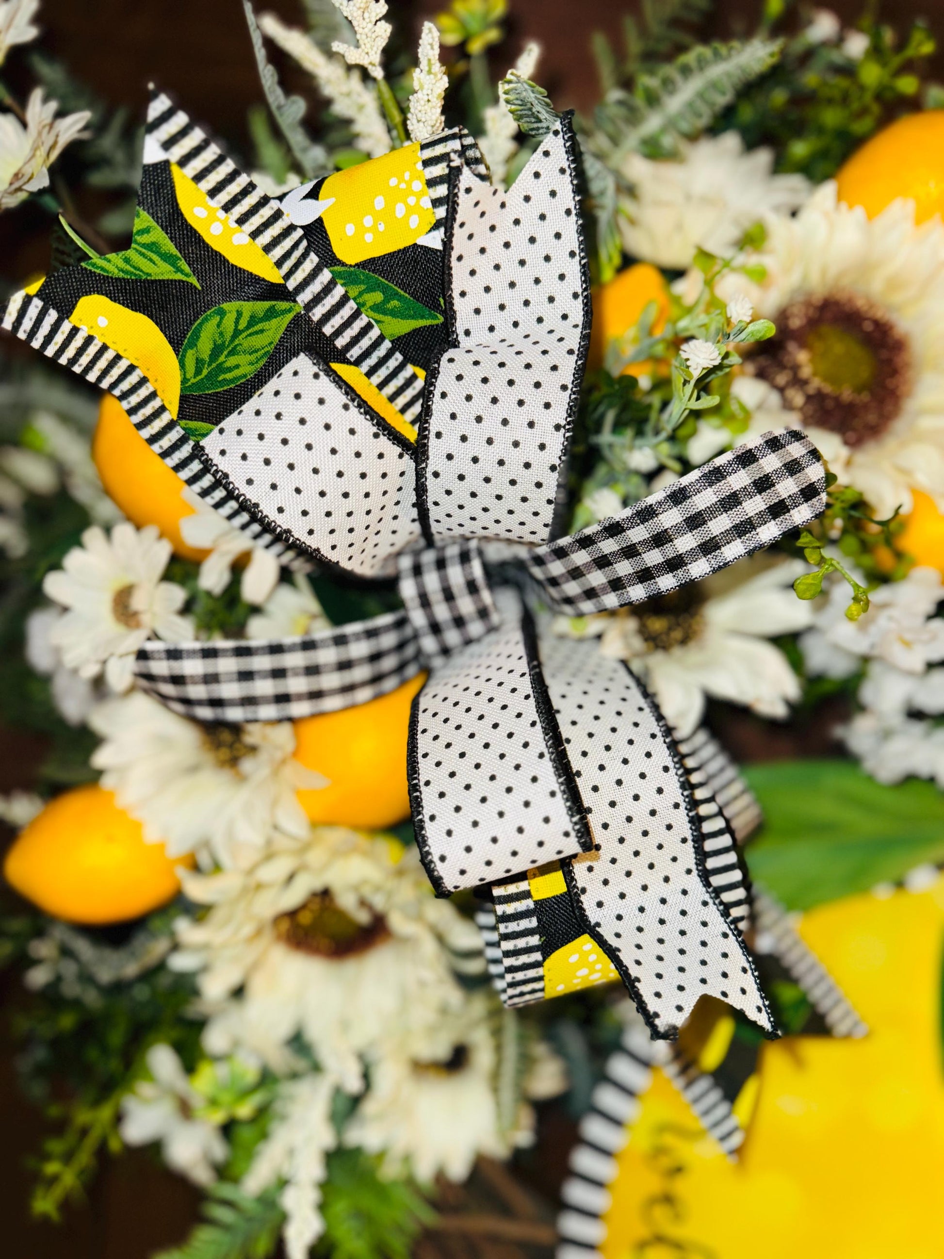 3. Bright Lemon Wreath with Gingham Bow – Farmhouse Summer Front Door Decor
