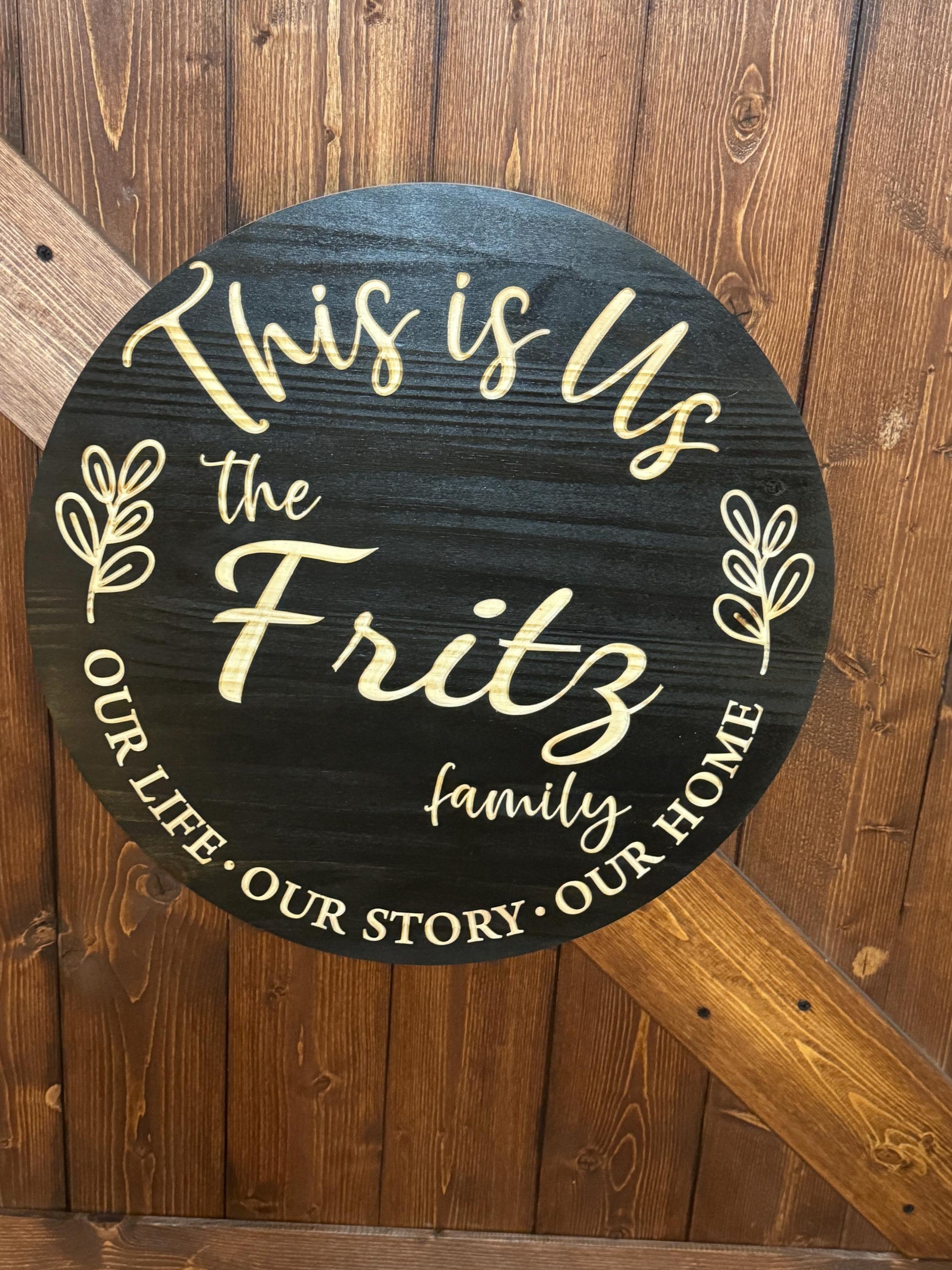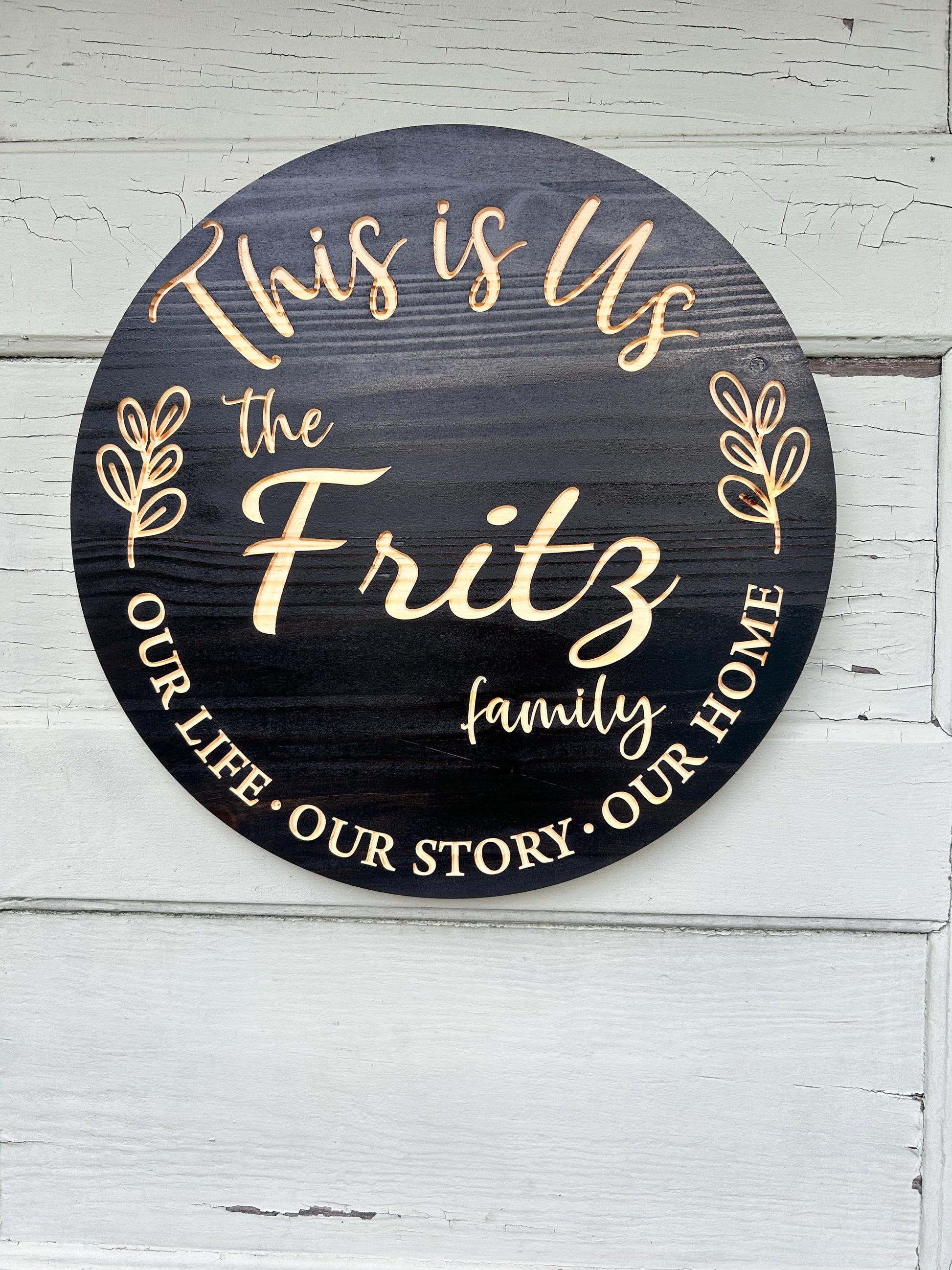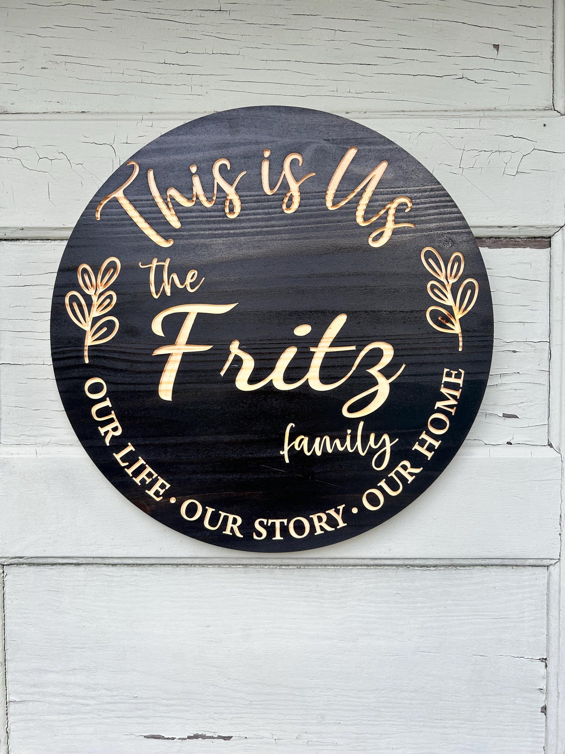Add a touch of warmth and personalization to your home with our beautifully crafted wooden family name sign. Measuring a generous 19.25 inches in diameter, this round sign is stained in a rich black finish and sealed for durability, making it perfect for both indoor and outdoor use.