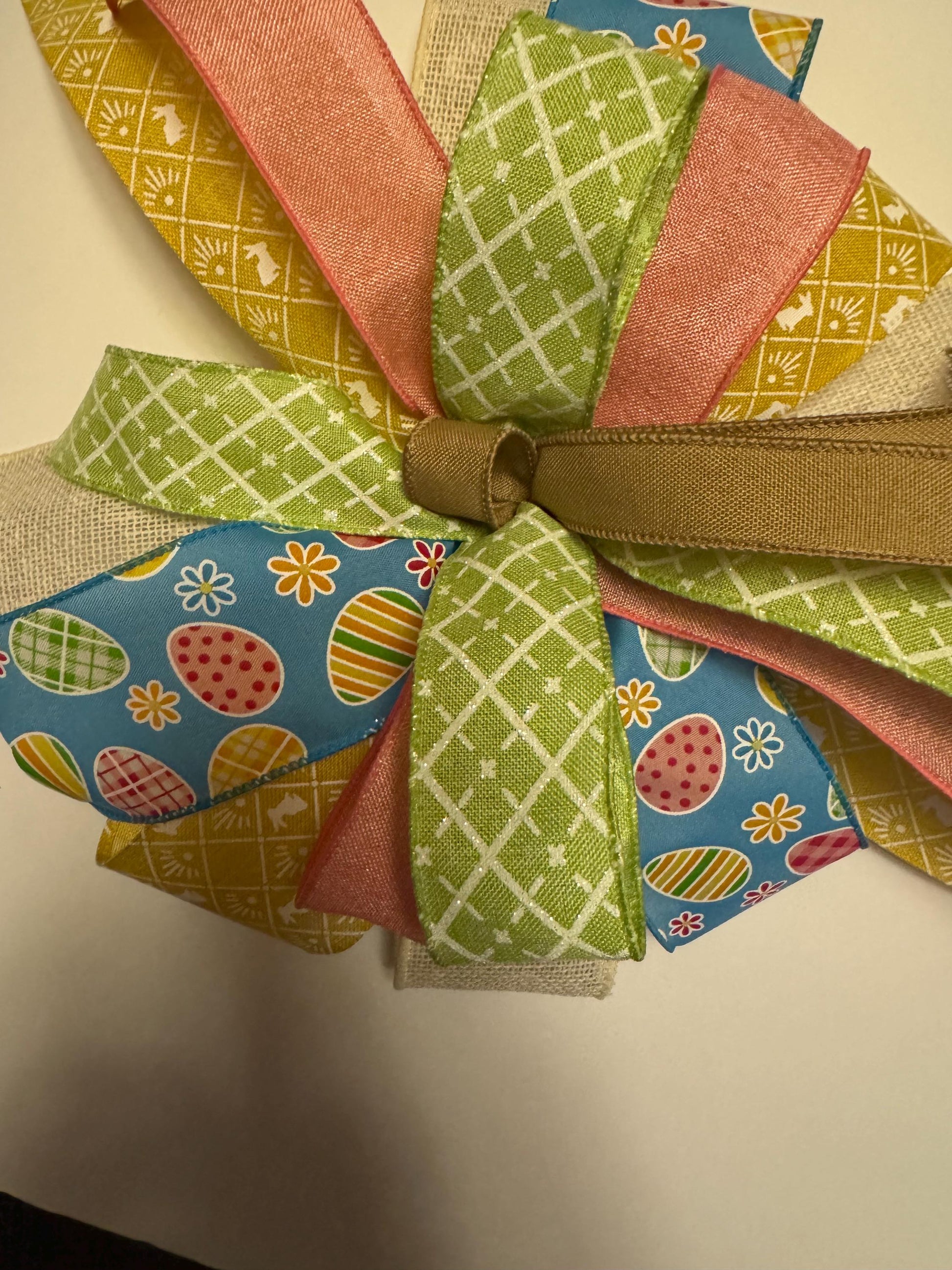 Bright and cheerful Easter-themed bow featuring vibrant pastel ribbons adorned with colorful eggs, flowers, and geometric patterns. This handmade bow is crafted with high-quality wired ribbon, making it easy to shape and perfect for wreaths, gift wrapping, or home decor. Its spring-inspired design adds a festive touch to your Easter celebrations, and the combination of blue, green, yellow, and pink hues ensures it complements any setup. Ideal for front doors, centerpieces, or holiday crafts. Bring a pop of color and charm to your seasonal decorations with this eye-catching bow!