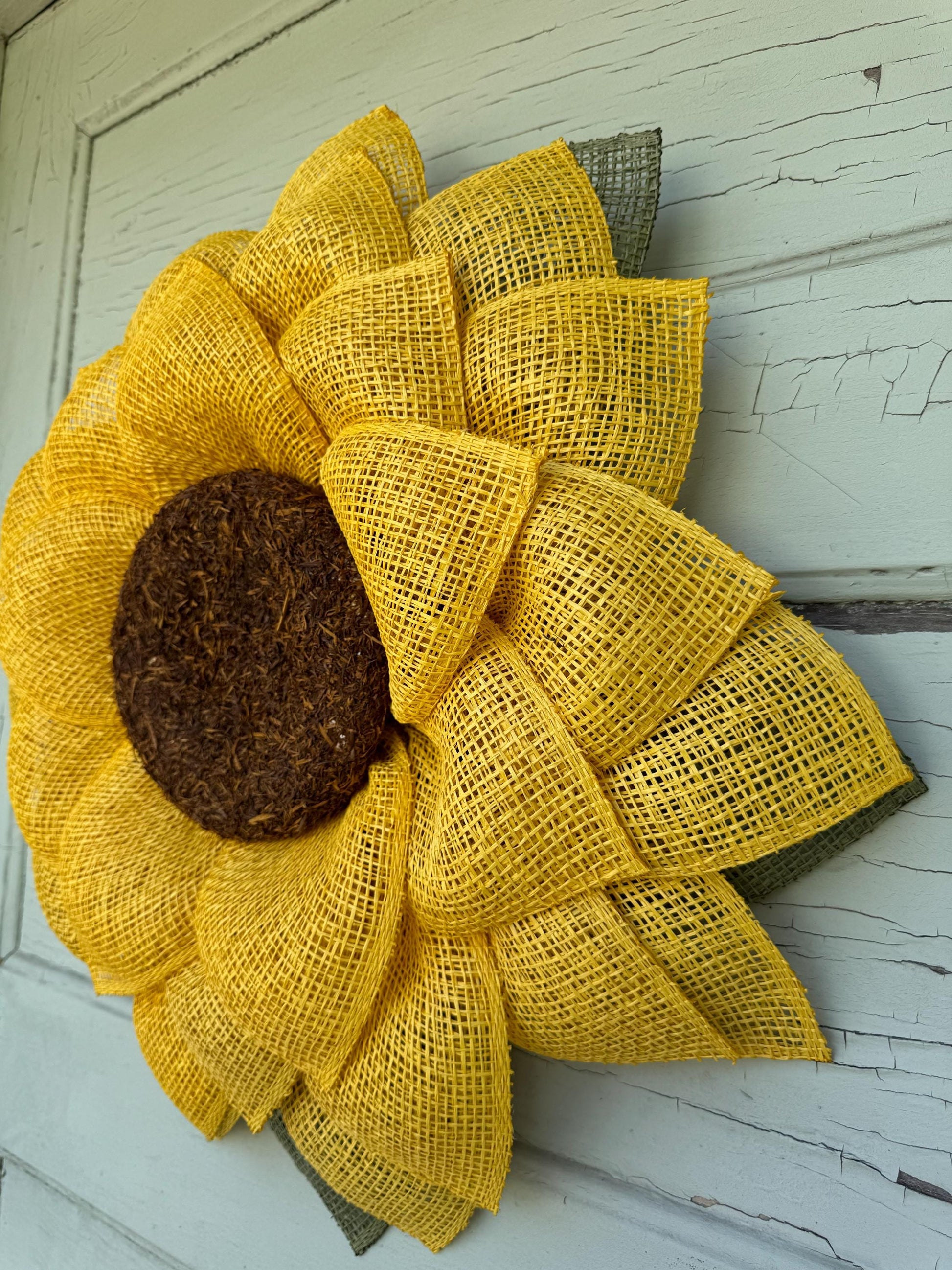 sunflower wreath, yellow burlap wreath, handmade flower wreath, rustic farmhouse decor, front door floral wreath, sunflower door hanger, fall wreath decor, summer flower wreath, burlap flower wall decor, farmhouse style wreath, large floral wreath, front porch wreath, sunflower home decor, farmhouse sunflower wreath, outdoor summer wreath.