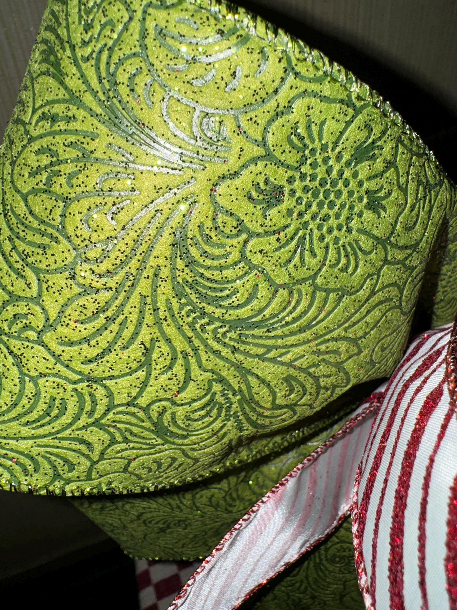 Add a festive touch to your holiday décor with this handcrafted large bow! Featuring rich green ribbon with a subtle pattern and glitter accents, paired with a vibrant, glittery red and white striped ribbon, this eye-catching bow is perfect for wreaths, lanterns, centerpieces, or holiday gifts. The layered design and wired edges allow for easy shaping to achieve a full and polished look. Whether you’re decorating your home or adding a special touch to your Christmas display, this bow brings warmth and holiday spirit to any setting.