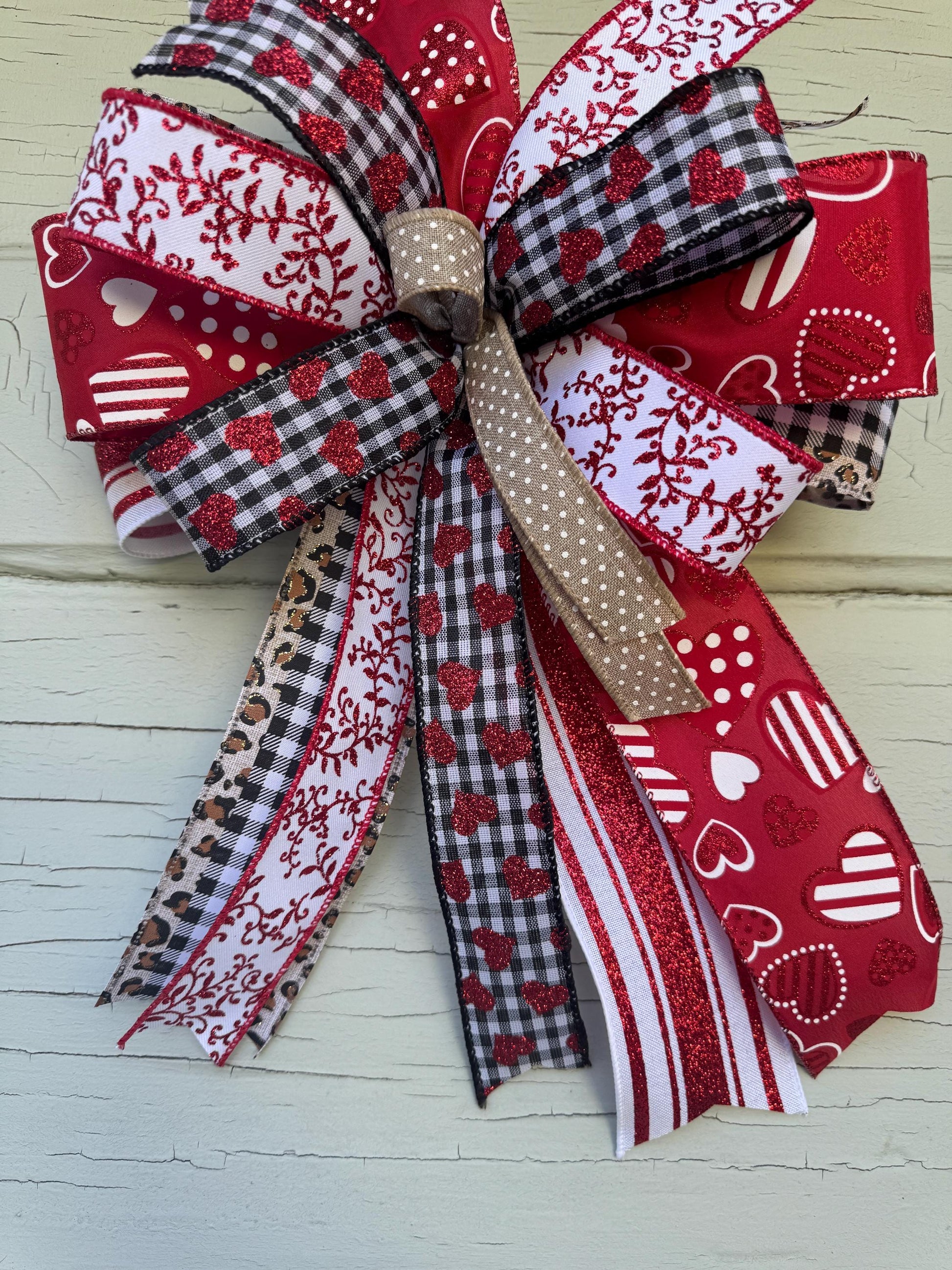 This handmade Valentine’s Day Bow is the perfect addition to your seasonal décor. Featuring an elegant mix of designer ribbons, this bow combines bold red hearts, buffalo plaid, and glittering accents with a touch of neutral polka-dot ribbon for a stylish contrast. The bow’s layers are meticulously arranged to create a full and eye-catching design, making it ideal for wreaths, lanterns, garlands, gift wrapping, or even as a charming addition to a Valentine’s centerpiece.
