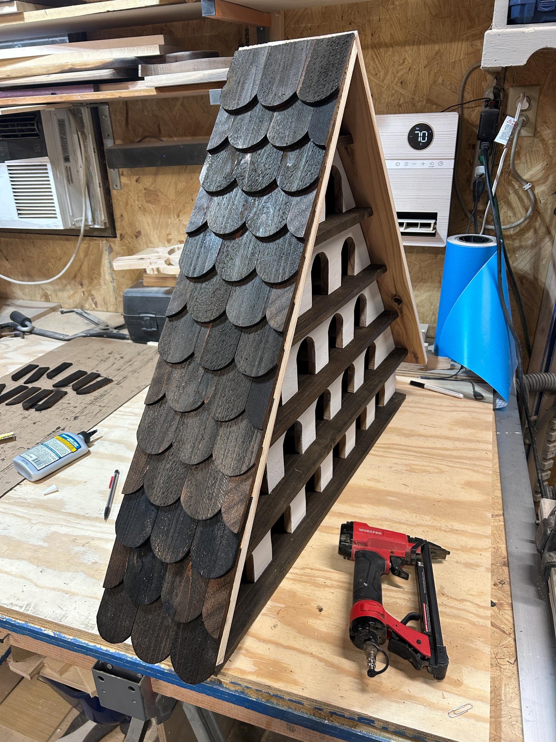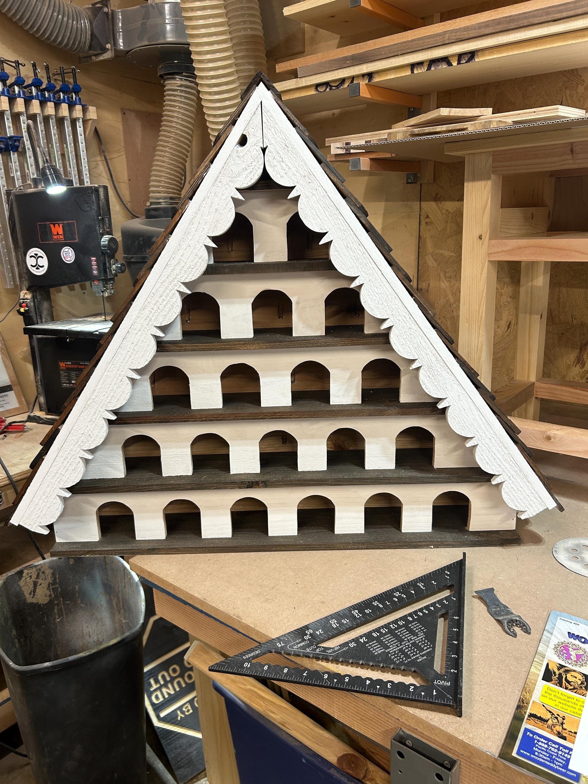Bring timeless elegance to your garden or porch with this handcrafted Victorian-style birdhouse. Designed with intricate scalloped trim, multiple arched entryways, and charming A-frame architecture, this eye-catching piece offers both beauty and function for your feathered visitors.