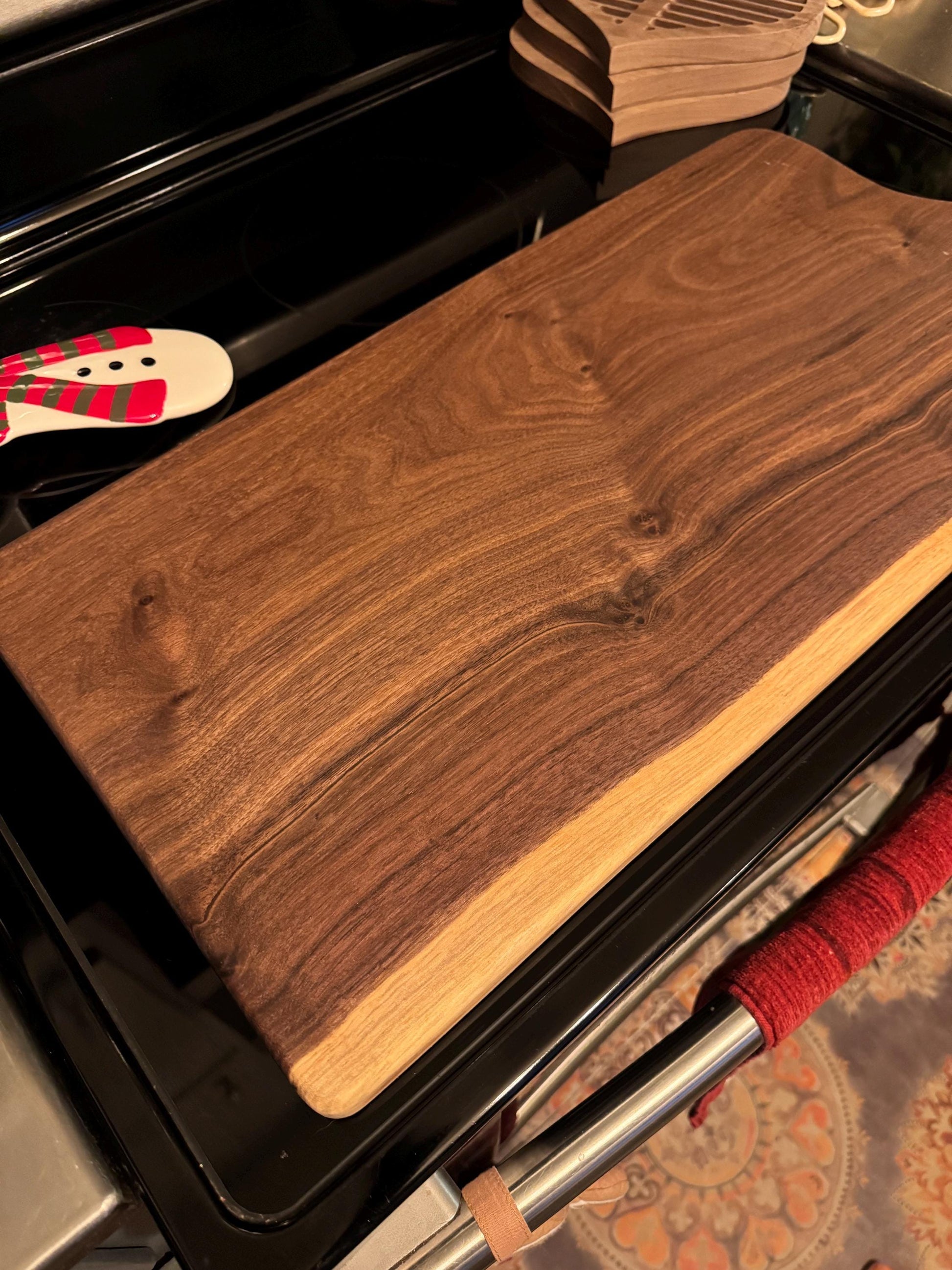 Walnut cutting board, wooden serving board, handmade cutting board, charcuterie board, walnut wood kitchen decor, rustic kitchen gift, farmhouse cutting board, food-safe cutting board, artisanal wood board, kitchen essentials, holiday gift, wedding gift, sustainable home decor, luxury cutting board, minimalist kitchen accessory.