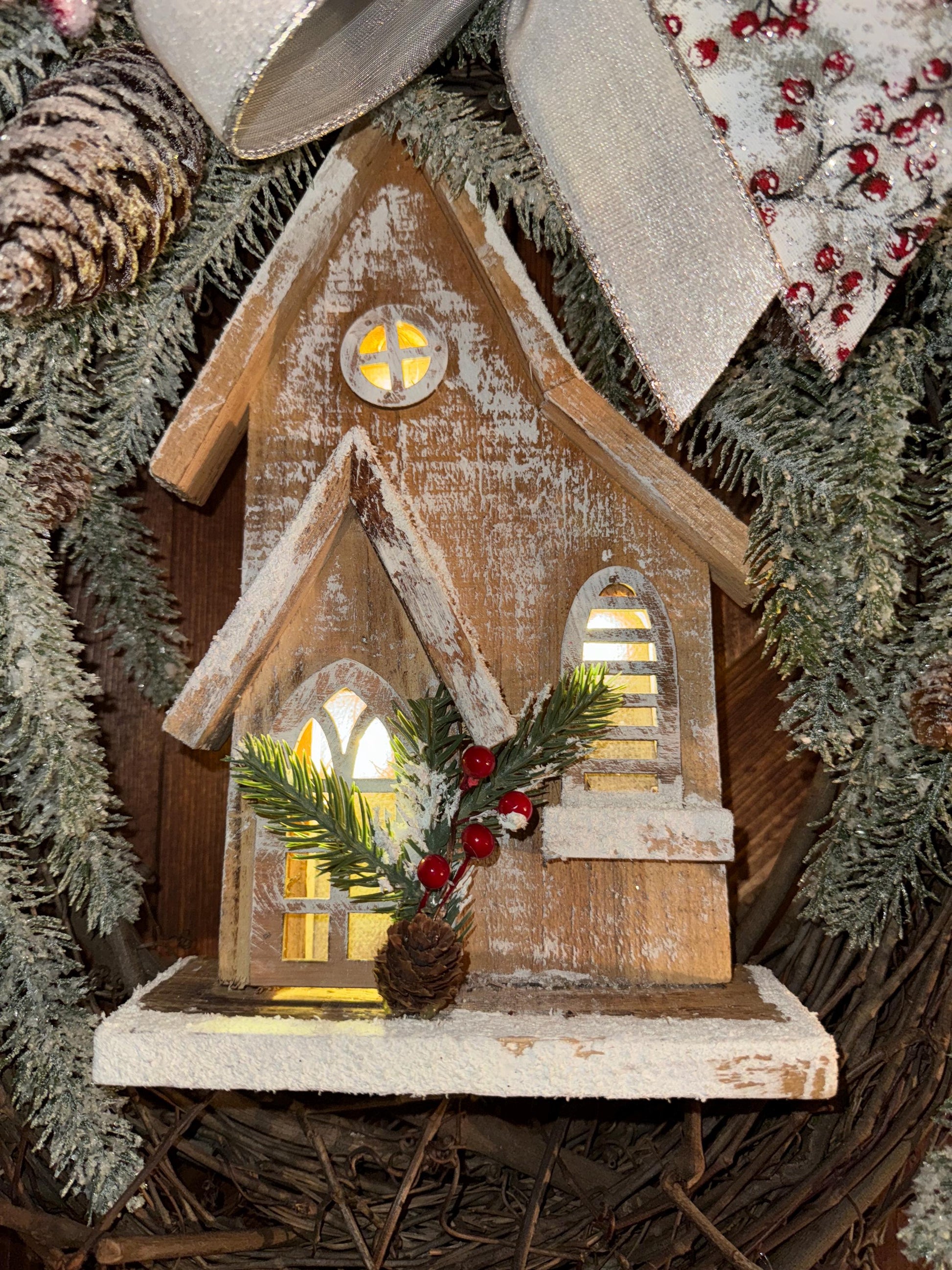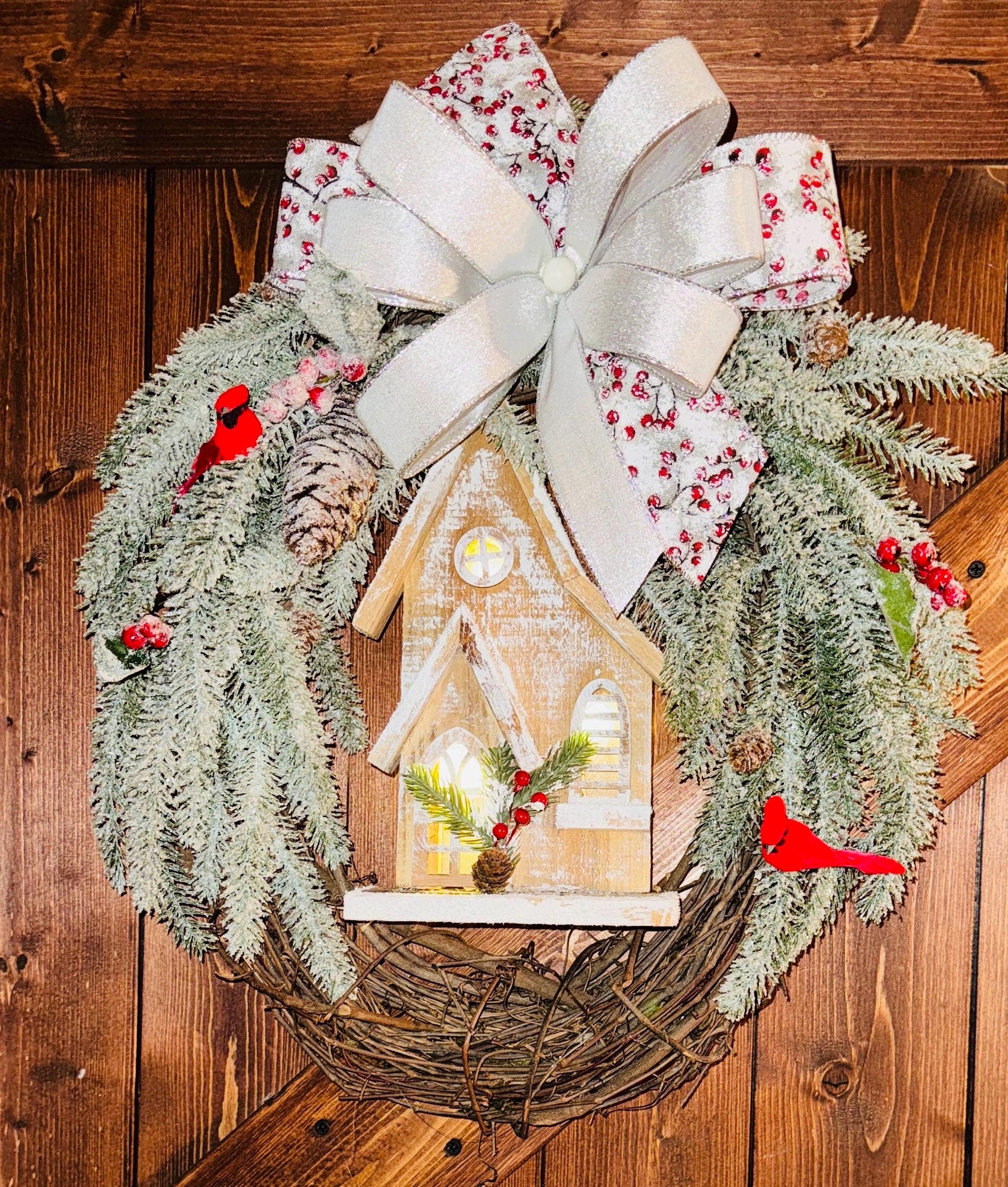 Add a touch of cozy winter charm to your home with this handcrafted wreath featuring a beautifully detailed rustic wooden house. The wreath is adorned with frosted greenery, pinecones, and bright red berries for a festive, natural look. At the center of it all is a glowing wooden house, adding a warm and inviting feel to your holiday decor. Two charming red cardinals perched on the wreath complete the scene, symbolizing joy and the holiday spirit. The elegant oversized bow with shimmering silver and berry accents ties everything together, making this wreath a perfect addition to your Christmas or winter decor. Ideal for front doors, entryways, or as a thoughtful gift for loved ones.